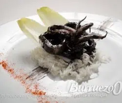 Saborea unos deliciosos calamares elaborados en su propio jugo y salseados con su tinta. Sírvelos solos o sobre un al dente arroz Basmati acompañado con endivia. Un plato que seguro repetirás.