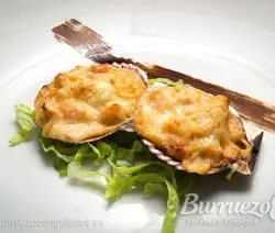 Vieiras rellenas de gambas y gratinadas con queso