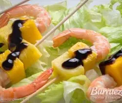 Os sugerimos un ligero aperitivo; una forma diferente de comer langostinos cocidos: en esta ocasión, lo preparamos en brocheta y lo acompañamos con fruta.