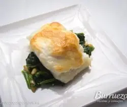 Lomo de bacalao gratinado sobre lecho de espinacas y piñones