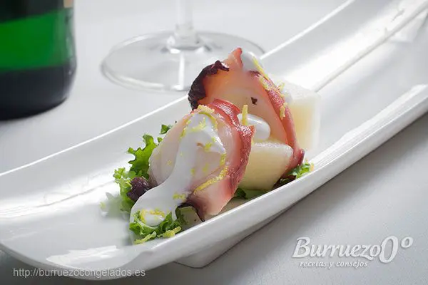 Hoy os recomendamos unas deliciosos brochetas de melón con pulpo, su preparación es muy sencilla, tan solo requiere una buena pata de pulpo cocida y un sabroso melón. Para darle un sabor más especial, la hemos acompañado de una emulsión de aceite cítrico. El resultado es redondo en boca y divertido de comer. Su elaboración es muy muy sencilla.