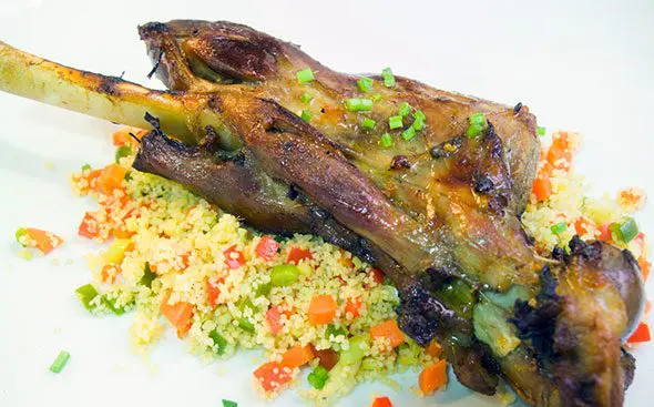 En plato llano y amplio, colocar una cama de cuscús con verduras y sobre esta la pieza de cordero. Salsear ligeramente con el jugo obtenido tras la cocción en el horno. Servir caliente.