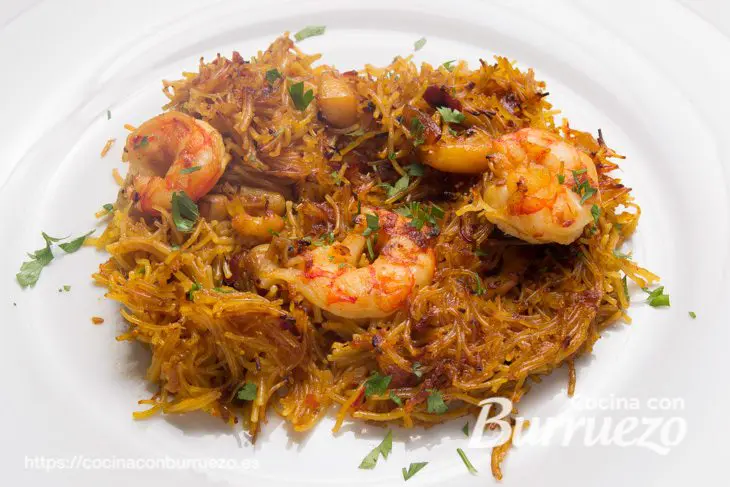 Esta crujiente y sabrosa fideuá de cabello de angel con pescado y marisco es un plato de pasta muy mediterráneo. Sorprende por su profundo sabor a mar y su perfecta textura en la boca.