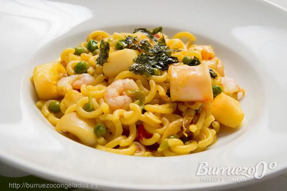 La fideuá marinera no es más que un pretexto para disfrutar de un gustoso plato con sepia, calamares y gambas. Parte de su secreto está en el fumet, elaborado a partir de unas pequeñas gambitas sofritas y una variada morralla.