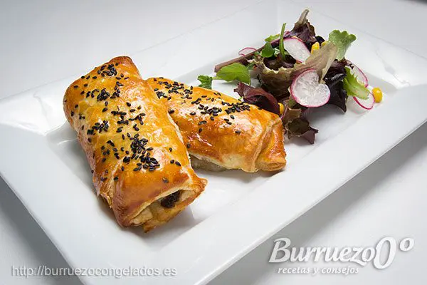 Deliciosos saladitos de salmón y champiñones, envueltos en una crujiente capa de hojaldre. La carne de este pescado mantiene todo su aroma y sabor, al cocinarse en el interior del hojaldre, junto con los jugos de la fina salsa que lo acompaña.