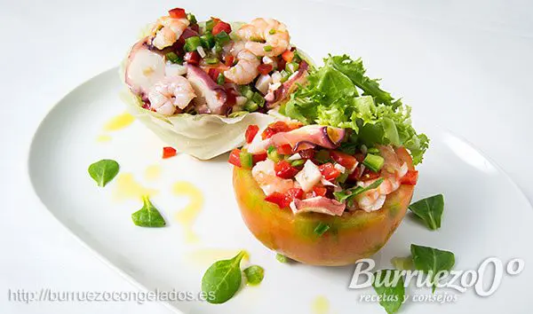 La combinación elegida, es un deleite para el paladar, los extraordinarios productos congelados de Burruezo, hacen de este cóctel un plato muy especial. La receta la puedes preparar con antelación y, ya frío el salpicón de mariscos, lo puedes servir como aperitivo o primer plato.