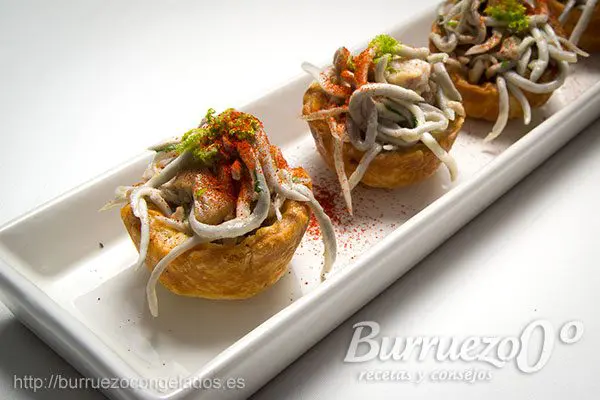 Esta original tapa, sorprende por su composición y su fino paladar. Recomendadas para todos aquellos que no tienen reparo en comer casquería, es sabrosa y diferente. La textura melosa de los sesos combina muy bien con la carne de las falsas angulas, el ajo potencia los sabores y el limón aporta un toque ácido y aromático muy agradable. El crujiente del hojaldre completa el bocado.