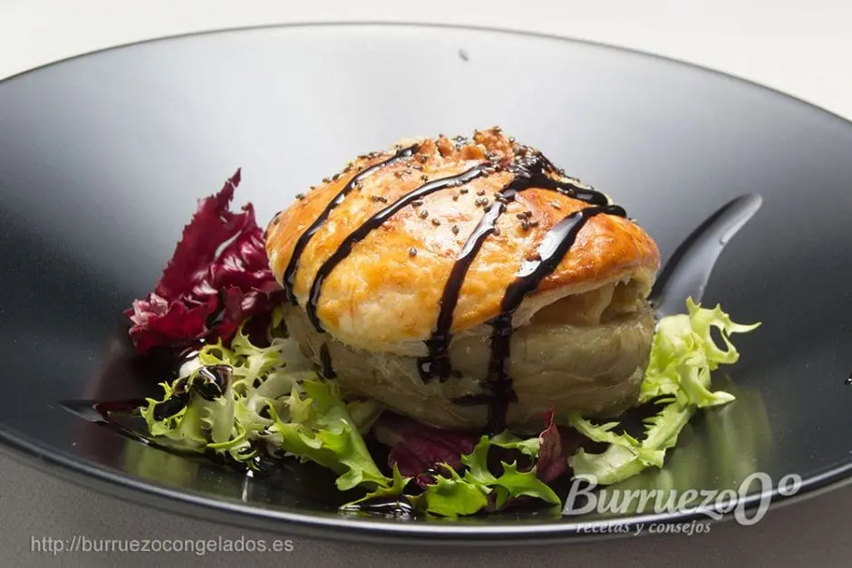 Este bocado es una deliciosa combinación de ingredientes, la carnosa alcachofa se ve potenciada por la deliciosa farsa que la acompaña, una sabrosa bechamel con boletus, la tapa de hojaldre le da el toque crujiente y original.