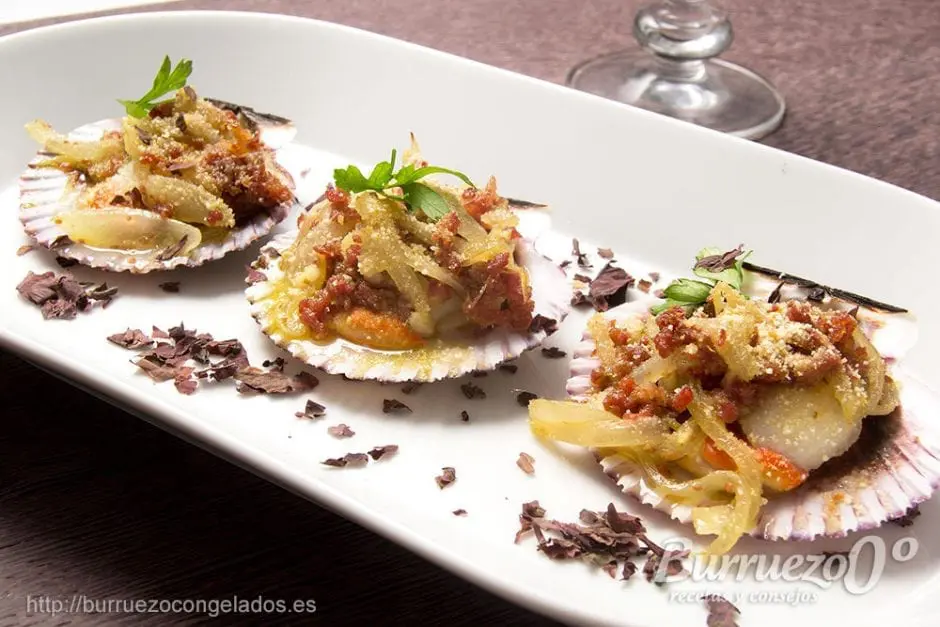 La zamburiña es un bocado carnoso, tierno y de un agradable sabor. Acompañadas con cebolla confitada y un poquito de jamón, se convierte en un aperitivo bien sabroso.