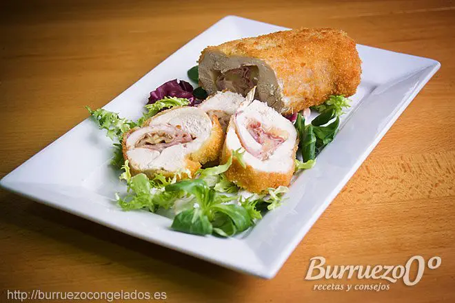 Divertido rollito de pechuga de pollo, relleno de suave jamón york y queso, con un crujiente rebozado, será la delicia de los más pequeños y de los menos. Su textura y sabor, acompaña muy bien a una fresca ensalada. Lo puedes preparar con antelación y freír en el momento de servir, para disfrutar al punto. O bien servir frío y sin empanar.