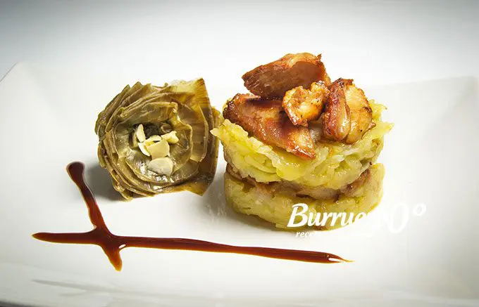 Con ayuda de un aro, montar un timbal alternando capa de patata con capa de conejo, acabando con carne y salseado ligeramente con el aceite del conejo. Colocar en paralelo una alcachofa confitada con sus hojas abiertas.