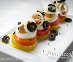 Deliciosas milhojas de ensalada murciana, muy sencilla de preparar y apetitosa.